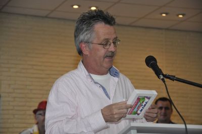 Durk van der Gaast, HJSC in eigen persoan, tidens de priesútreiking. Dizze un bitsje fage foto geeft goëd ut sfearke wear su't ik dat gisteravend onderging: smûk & gesellech in de HJSC tent!
