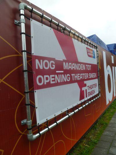 Nòch mar fijf maanden en Teater Sneek opent wagenwiid syn deuren foar ut hoochearde públyk met un KOMT BINNEN! Op’e skutting rond ut teatergebou in anbou an de Westersingel is dy ankondeging anbrocht. Spitech dat binnen un dach ut siferke 5 foar ' sufeul maanden nòch te gaan ' lutten is, mar dat is dan even nyt anders.