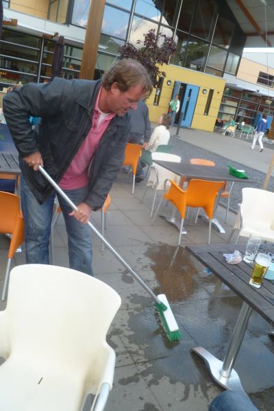 In ut kader fan de maatskappeleke staazje, dy’t sommegen onder oans nòch altyd doën moesten, wurdde ut angename met ut saakleke kombineard. Su kreech ut hele terras fan ut Stay Okay Hotel un grondege skoanmaakbeurt.