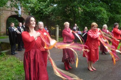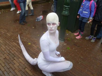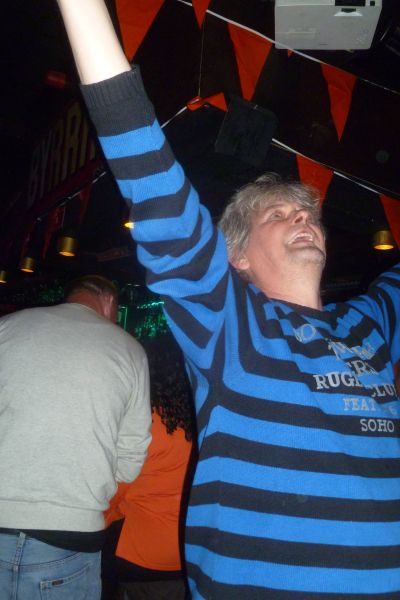 Om un uur òf seuven naar ut Groëne Straan. Dêr speult de Amsterdam Klezmer Band. Ut is der swart fan ut fòlk dat helemaal út syn dak gaat. Hier daanse inderdaad nòch al wat flower power meiskes, nou met un stief sittend kapper Wolhúzen permanentsje in ut grize haar. Moai gesicht man!Opfallend dat der bier en wyn dronken wurdt út écht glazen, dus nyt út plestykbekers. Der is amper rotsoai op ut terrein. At ut echte genieten beginne sal, bin ik al onderwech naar de boat.