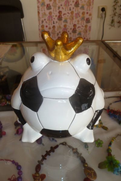 En ok dochter Piety, ehhh... Katrein Kunst, speult op de aktualiteit in. Moaie foetbalspaarpotten in har winkeltsje an de Skarnestraat. Stienen foetbalkikker spaarpotten koste mar un prikje, € 12,50 loof ik.