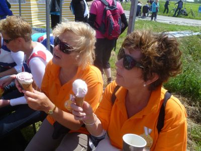 Ut aldermoaiste moment leit tòch bij de finish at Fokkelien en har jonges oans taan op te wachten. Want ondanks alles het dizze tòch foar mij, foar oans ambivalente gefoëlens. Myn frynd en buurman Willem van Netten is der fandaach nyt mear bij. Hij dy’t su fol sat fan de Slachte, dy’t mij anmoedegde om 4 jaar leden met te doën is sinds foarech jaar Sneekweek an de Andere Kant.