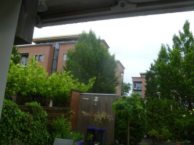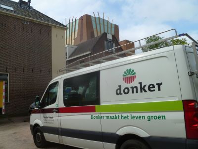 Sinds dizze week binne de minsen fan Donker druk bezech met de anlêch fan de daktún op ut teatergebou an de Westersingel. Alle dagen at ik der langs loop òf fyts, sien ik omhooch. Tòt nou toe hew ik nòch gyn strúken, bomen òf bosjes laat staan un teatergeit ontdekke kannen. Su gau at ik dat sien laat ik myn Lumix ut werk doën. Wel binne de bedriëfswagens fan Donker sinjaleard.