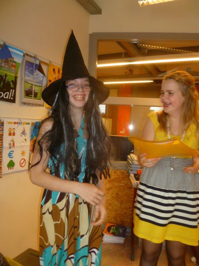 Uteraard bin ik dêrom fanmòrren mar op myn fytske stapt om dizze ferrassing in ontfangst te nimmen. Ankommen op skoal, ston ut ontfangstkommité al klaar, prachtech in de ‘ mooie kleren ’. Tegare met myn kollega Hans, dy’t frijdachmòrren myn coachgroep waarnimt wurdden wij naar oans lokaal toebrocht. De hele klas met kleurege ballonnen en flagjes fersierd. ‘Hebben we gistermiddag gedaan, wel tot 4 uur op school gebleven…’