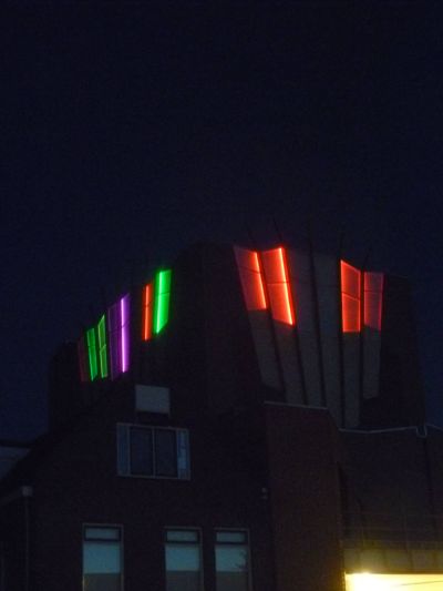 Hierbij! Sukrekt dizze foto's maakt fan ut nieuwe Teater an de Westersingel. Siet der futuristys en feeëryk út bij oans in de achtertún!! Twittergoeroe Wopke het ut over DISKO!! Mar dan wel un ferrekt moaie disko! Earder op'e avend sach ik al groate modderbulten op ut dak fan ut Teater.
