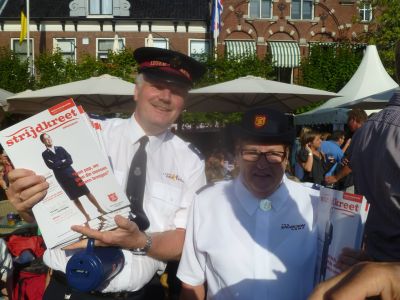 Eigenlek bin ik wel un bitsje anty-leger en lui in únifòrmen hewwe myn bekoaring ok nyt. Uteraard de goeien nyt te na sproken, want dy binne der sondermear! Groate útsondering binne foar mij de mannen en frouwen fan ut Leger met un groate EL: dy fan ut Salvation Army! Ok in Sneek is der un hele groep fan ut Leger des Heilsleger aktyf. Se hewwe myn sympaty omdat de measten altyd fleurech en opgewekt binne. Gistermiddach, na ut ene buike toen de son wear deurbrak op ut mega groate terras op de Marktstraat kwamen de Heilsoldaten bij oans. Met kollektebuske en de Strijdkreet.