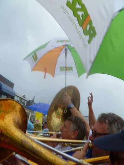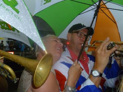 Optreden Blauhúster Dakkapel bij ’t Ouwe Vat. Gisteravend, even teugen acht uur, opent de hemel de slúsdeuren en falt ut regenwater met bakken út de lucht. Binnen no-time, in un splitsecond siet ut oranje-groën fan de Poiesz-paraplu’s! Werkelek meesterlek bedocht deur direkteur Kees Poiesz wurde der tientallen regenskermen útdeeld an ut nòch massaal anwezege públyk. Blauhúster Dakkapel-fans staan op ut poadium om de mannen te beskermen teugen al dy regen. Ondertussen speule se letter de blaren op’e lippen onferdroaten deur. ‘ Raindrops keep falling on my head…’ Je mutte der mar op komme! Der ontstaat un wondermoaie sfear, amper te fangen in woarden, des te beter in de onderstaande beelden.