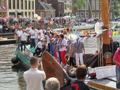 Dy intòcht deur de Prinse- en Koopmansgracht maakte dit alderlaaste optreden in un Sneekweek tòch wel heel bysonder. Bij ’t Ouwe Vat ankommen was ut swart fan ut fòlk dat ut dweilòrkest met un ovasy begroette.