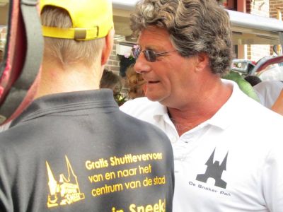 Nico Altenburg, één fan de tientallen Shuttle-frijwilligers, is ok drager fan ut Hufter Sneekweek T-shirt. De aimabele Sneker frijwilliger parkearde gisteravend de elektise shuttle graach even over de ingang fan Café De Kroon om ut shirt te promoaten!