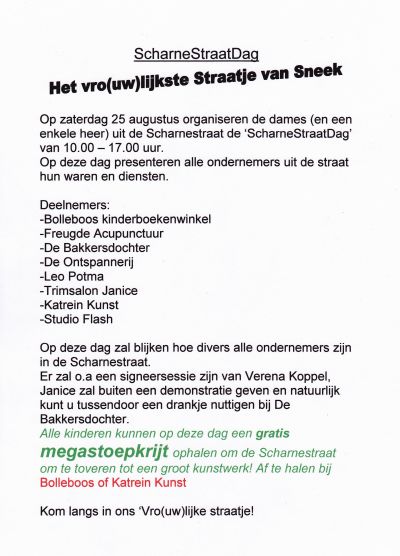 Frouwen bloat handel doad? Je súden ut wel sêge met dizze tropise temperaturen! Mar in de Skarnestraat is dat absolút nyt ut gefal! Sterkernòch dêr binne ut met name de frouwen dy’t handel driëve. Nee úteraard nyt bloat! At ut al us even rustech is dan beginne de ondernimmende dames te praten met mekaar, over saken en diënsten. Stuk foar stuk meiden dy’t fan dit Sneker straatsje in de binnenstad un bloeiende retail-allez make wille. Ut nieuwste idee is om op saterdach 25 augustus anstaande un SCHARNESTRAATDAG te òrganisearen. Ferskillende persburo’s kregen al un bericht fan de ladies toestuurd: