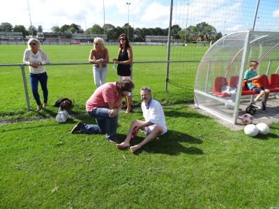 Ondertussen leit Bernhard ut cold-pack al op ut blessearde plak en gaan der meters swachtelferbaan om heen. Dizze kearel weet fan wanten. Ik laat ut allemaal over mij komme en strompel naar de boks. In alle stilte overdenk ik myn persoanleke ellende. Bin ok nyt gek, hew al lang sien dat der ferskillende ploechgenoaten bij ut anskouwen fan myn blessure krekt even te entûsiast infòrmeard hewwe hoe’t ut met mij gaat. Ik sien se denken, ‘ dy binne we de earste weken gelukkech kwyt ’. Ik bin bang dat se gelyk hewwe. O.N.S.1 trener Jan Vlap is nòch un graadsje erger, hij nimt un foto en twittert ut de hele weareld over dat de nieuwe anfoerder fan O.N.S. 7 de anfoedersbaan wat op un apart plak sitten het. Dêr gaat dyn wisselgeld Vlap! Foarlopech is ut 1 – 0 foar dij!