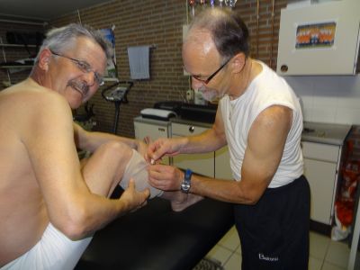 Ankommen bij de boksen staat Bernard Pijper, fersòrger fan O.N.S. 1 al klaar. Siet mij met un blik an fan ‘ wêrom tòch nòch altyd dat spòrtieve kompensasygedrach jonkje?’ Ik kom in ut heilege der heilegen fan Bernhard en hij foëlt even an ut kút. Omdat Bernard jarenlange ervaring het lepelt hij de teory su even foar mij op: “ Een zweepslag is pijnlijk en leidt tot een wekenlange onderbreking van de normale activiteiten. De behandeling bestaat in de beginfase met name uit rust en koeling en soms een hakverhoging.”