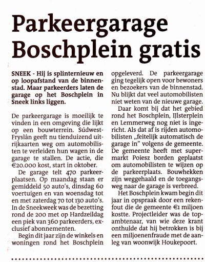 Ut artikeltsje staat in de LC fan gister. Foar alle dúdelekheid: ' Súdwest-Fryslân wilde tienduizend uitrijkaarten weggeven om automobilisten te verleiden hun wagen in de nieuwe garage op het Boschplein te stallen. De promotieactie, die € 20.000 kost, zou in oktober starten. Maar na protesten van de Vereniging Sneker Zakenlieden ( VSZ) is dat voorlopig van de baan. Een maand lang voor niks parkeren is oneerlijke concurentie, vinden de ondernemers.'