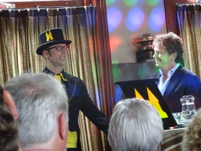 En dat was eigenlek illústratyf foar dizze middach, ut ontspannen sfearke. Stadsomroeper Jan Sjoerd de Vries is un kearel met un stem as un klòk, mar ok heel ad rem! Hij bewearde ut één na oudste beroep fan de weareld te hewwen. ‘ Toen de públike frouwen gyn genoech klandisy mear hadden, skakelden se oans, de stadsomroepers in…’