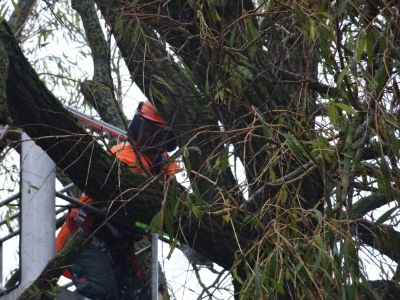 Na W. syn telefoantsje de kuierskoënen an en der op út. Op de Westersingel waren Gerben en syn maat fan de gemeente SWF inderdaad druk bezech met ut rigoreus snoeien fan de treurwilgen. Allemaal nòch werk na anleiding fan de stòrm fan un antal weken leden. Moai om te siën hoe’t sukke mannen an ut werk binne en dat oh su presys doën, niks der mar wat dom in omfege! Ik hew der un antal foto’s fan skoaten.