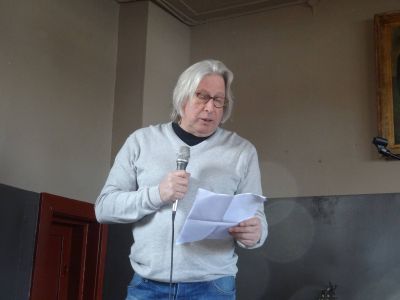 Ik mach na Ilse Hoekstra de kleine Bühne op en lees o.a. dry fersen foar út de syklus over Joadse Snekers. Ik fyn ut wel passen op dit plak dêr’t oait de family Pino werkte en woande. Ok lees ik fertaalde fersen fan Joop Slagter foar.