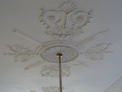 Decorum in ut Sneker kantongerecht: ornamenten teugen ut plafond met symboalen fan de rechtspraak.