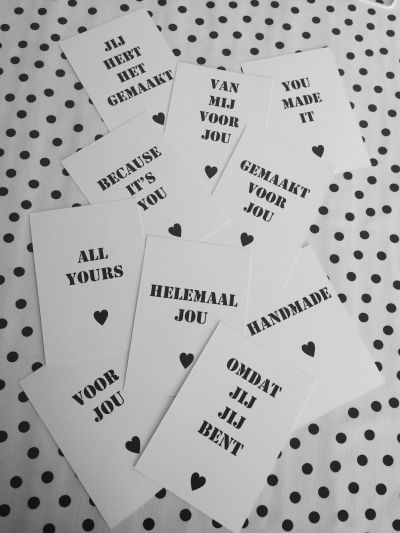 Natuurlijk zijn de kaarten ook de bestellen via www.facebook.com/Gemaakt4jou en gemaakt4jou@outlook.com. De kaarten kosten €1,25 per stuk en een hele set van 10 kaarten €12,50 met een gratis hanger om een favoriete kaart een mooie plek te geven.”