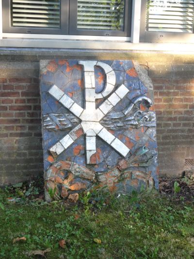 “ Bij de uitbreiding in 1958 van de christelijke kweekschool aan de Parallelweg werden door de kunstenaar Anno Smith uit Eelderwolde op de zij- en voorgevel van het gebouw verschillende muurdecoraties aangebracht. Bij de heropening van de school vertelde Smith dat het keramiek op de zijgevel een uit het christelijk monogram opspuitende fontein voorstelt.