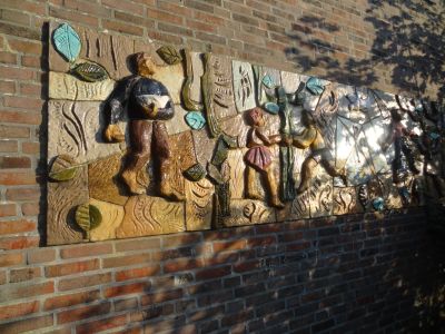 Op de muur fan de skoal brocht de Sneeker kunstenaares Cobie Doevendans un keramieken muurreliëf an. Dêrop un foarstelling fan speulende kyndes met de Bibel as middelpunt.