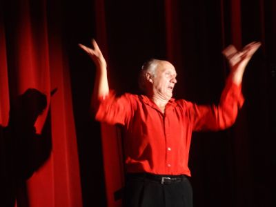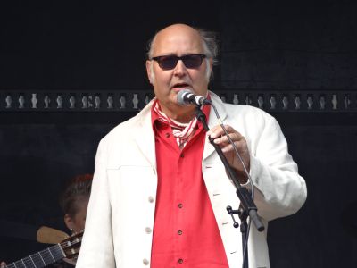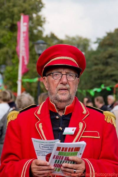 Stadsomroeper Jan Sjoerd de Vries leest opstellingen foar en maakt wear reklame foar de stad!
