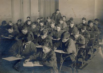 Apart idee eigenlek dat gyneen fan de minsen op dizze foto mear in leven is. Fan een fan dizze persoanen weet ik un bitsje mear as fan de anderen, omdat ut myn fader is. Benedictus van der Veer, Hij sit links foaran met ut briltsje. Ut is un oud kiekje fan de Ambachtsskoal út Liwwarden út begin fan de twinteger jaren út de foarege eeuw.