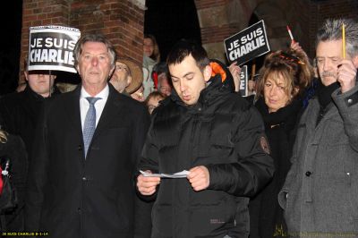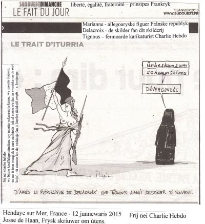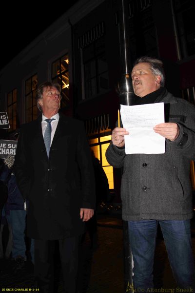 Fanavend hew ik metdeen an de protestbijeenkomst Je suis Charlie op de Waterpoort en in de Marktstraat. Tientallen minsen waren anwezech, mar de macht sat um absolút nyt in ut antal. Wel in de woarden fan burgemeester Hayo Apotheker dy’t syn afskúw útspraak over de gebeurtenissen in Parys. Uteraard referearde Apotheker an ‘hoe groot goed democratie is en het recht van vrije meningsuiting ’.
