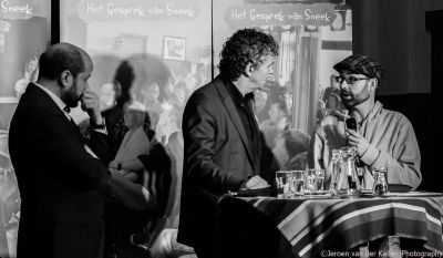 Dat gold seker nyt foar de Sneker inbreng fan ut programma. Jan Roelof Middeldorp debútearde, enkeke weken na ut siën fan Abraham, as dichter in ut openbaar. Hij deed dat, krekt as ut overgroate deel fan de dichters, met twee fersen. Ut fers over un dementearende moeke fon ik rondút indrukwekkend: ‘ dat je niets meer van het leven weet/wie je was en wat je deed’ Moai om te horen dat de godfather fan de Friese dichters Piter Boersma, de Sneker debútant na afloop froech om ok fòlgend jaar wear met te doën! ‘ Doe ik zeker, en dan in ut Snekers’, beloofde Roef! Ok wear anwezech Anske Smit, met un fertaling fan un fers fan Willem Wilmink in ut Hylpers. Ridzert Postma en Marrit Jellema maakten ut haanfol Sneker poëten fol.