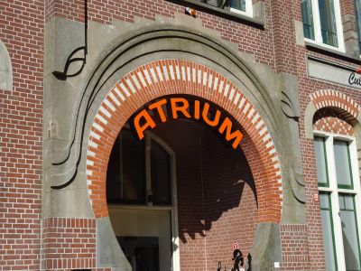 Fiel mij fanmiddach foar ut earst op an de gevel fan 'myn' Eben Haëzerskoal. Dêr't froeger de onbegrypleke woarden Eben Haëzer pronkten staat nou te lezen dat ut Cultureel Kwartier Atrium Kunstencentrum hyt. Ik fyn ut prachtech!