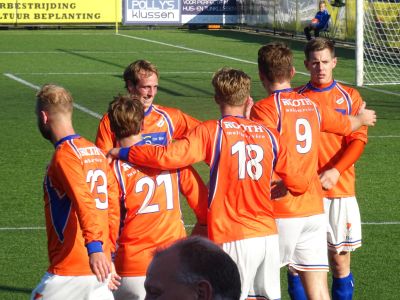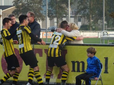 De jarige Rein Werumeus Buning ( nr.20 ) neemt na afloop de felicitaties voor zijn doelpunt in ontvangst