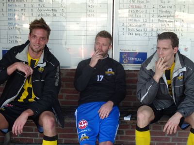 Na de warming-up bleek dat aanvoerder Chris de Wagt teveel last had van een achillespeesblessure zodat hij niet inzetbaar was. De dubbelrol van De Wagt, die van speler/coach, werd dus vanmiddag een enkelrol voor de routenier. Die rol van coach vervulde De Wagt overigens met verve. Niet zo verwonderlijk, want hij bezit de trainerspapieren, sterker nog hij is trainer van zondag tweedeklasser S.V. Olyphia. Roelof Strikwerda verving De Wagt in de achterhoede. Ook Danny Kampstra haakte op het laatste moment af, zijn vervanger werd Frits Dantuma.