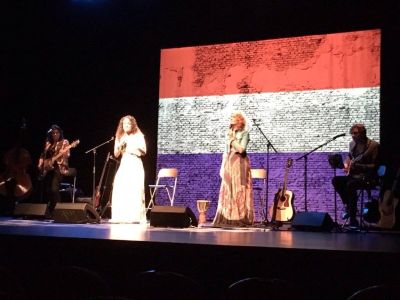 Het decor, een doek met daarop een ruïne-achtig verweerd muurmotief waarop wisselende beeld, o.a. een Nederlandse vlag, geprojecteerd werd dragen ook bij aan de intieme sfeer van het programma. Nergens wordt het schreeuwerig en juist door die ingetogenheid komt wat het viertal over wil brengen binnen bij het publiek. Er is heel veel herkenning voor het oudere publiek , waar was de jeugd gisteravond? Dat een groot gedeelte van de Sneker gospelgroep ( ooit door mij als ‘de witte negers van Sneek’ getypeerd ) Signalen met hun muzikale leider Wilco Kloosterman aanwezig was, moet vooral Izaline goed gedaan hebben. Zij trad al eens op met de Signalen.