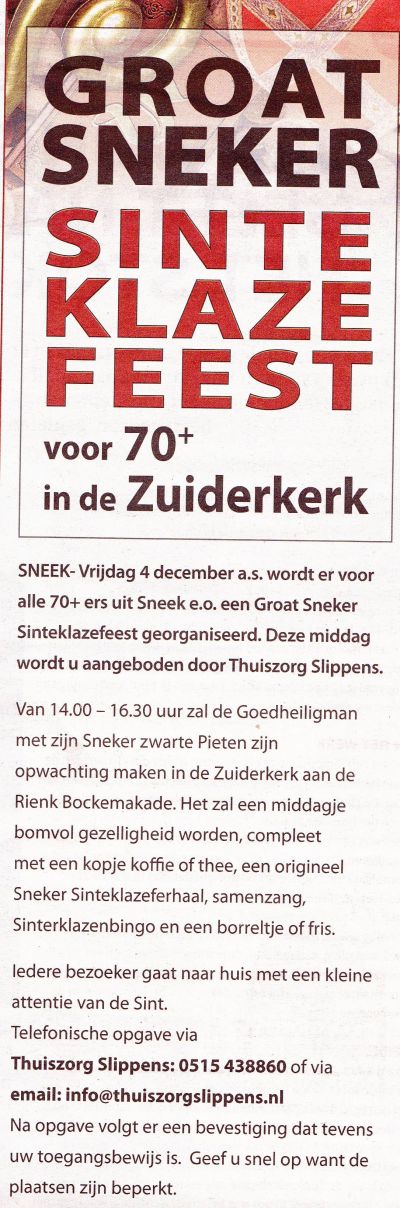 Jantine Slippens, fan Thuiszorg Slippens, is momenteel druk bezech (tegare met har neef Kees Poiesz ) met de òrganisasy fan ut earste Groat Sinteklazefeest foar 70+ in de Súderkerk.
