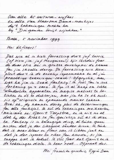 Nadat de kyndes de tekekeningen maakt hadden deden we dy in un groate enveloppe en wurdde ut pakketsje bij Eppie Dam in Balk besòrgd. Nyt lang dêrna kregen we un brief fan de auteur. Haanskreven. Ut liekt mij un moai literêr dokument!