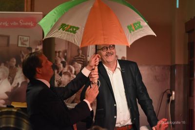 Tsja… en dan oans gast fan ut Haagse plús Alexander Pechtold. Ik fyn ut altyd un bitsje overdreven at Snekers sêge Ut Gesprek fan Sneek. Goh LEUK Alexander Pechtold komt ok! Ja, nou én? Ut sú un saaie boël weze at Pechtold hier fanmiddach allienech staan had. Dêrom bin ik Lieke blij met al dy andere gasten dy’t hier fanmiddach wear waren. Mar goëd omdat Alexander Pechtold noait te beroerd is om un bitsje reklame foar oans stad te maken wú ik hem ok un kadoatsje metgeve. Un orizjinele paraplú fan Loadsje Poiesz. Ut is echt ut allerlaatste eksemplaar. Mar dat sêge we alle kear wear at we su’n Haagse politikus naar hús stúre!