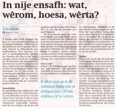 Wear un bysonder opbouwend artikel over de Friese literatuur. Bovenstaand stukje staat fandaach in ut Friesch Dagblad. Moai om de nieuwe jaargang fan ut literêr tydskrift Ensfh 2015 su te beginnen. Hier kanne al dy Friese skriëvers wel wat met.