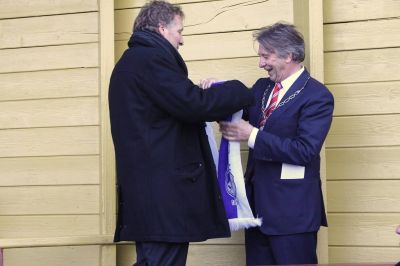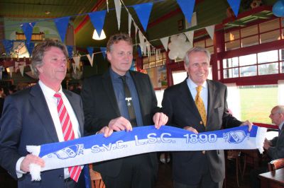 Op de andere foto staan burgemeester Hayo Apotheker, foarsitter Henk Douwsma en oud-LSC 'er Wietze Couperus.