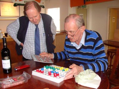 Hielke Brouwer als bingo-meester bij O.N.S. met links ds. Jan van der Veen, foto Douwe Tiesma