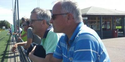 O.N.S. bestuurslid Jan Dijkstra en scheidsrechter Bronsvoort bestuderen de buienradar. Nergens meer voor nodig, het voetbalveld is een groot waterbassin waar op voetballen onmogelijk is.
