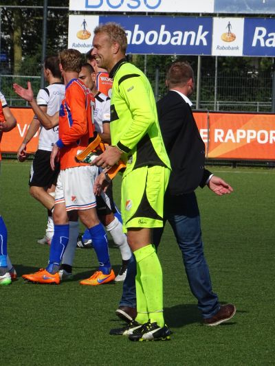 The winner takes at all! Keeper Eelke Kooistra viert zijn feestje na afloop van de wedstrijd