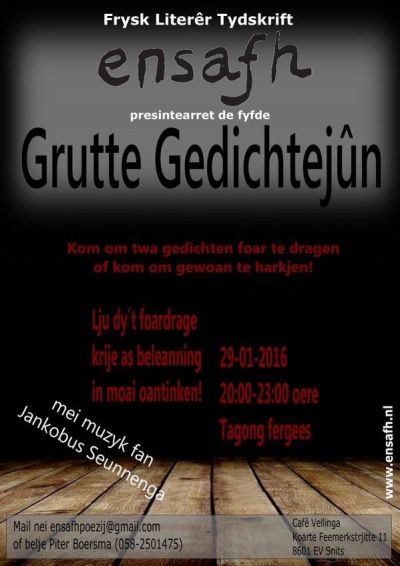 - Dichters kinne twa of trije gedichten foarlêze . - Poëzyleafhawwers kinne har favorite gedicht foarlêze. - Gewoan komme te harkjen. Dichters en foarlêzers wurde fersocht har op te jaan by de redaksje fan Ensafh troch te mailen nei ensafhpoezij@gmail.com Skilje nei Piter Boersma (058-2501475) kin ek. Foar mear ynformaasje kinne jo ek by boppesteand adres en telefoannûmer telâne. Alle dichters en foarlêzers, ryp en grien, binne wolkom. It makket net út yn hokker taal de gedichten skreaun binne, dat jildt ek foar streek- en oare minderheidstalen. De dichters en foarlêzers krije allegear in no noch geheim presintsje, en, omdat foarlêzen toarstich makket, ien konsumpsje fergees.