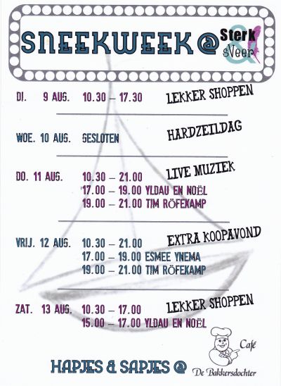Froeger ( wannear was dat? ) gingen de minsen om boadskap de stad in. Teugenwoardech en seker in de Sneekweek wil ut winkelend públyk beleving. Sterk &sVeer loopt regelmatech foar de troepen út, is ut nyt met un eigentiids únyk Magazine dan wel met Live Muziek in de winkel.