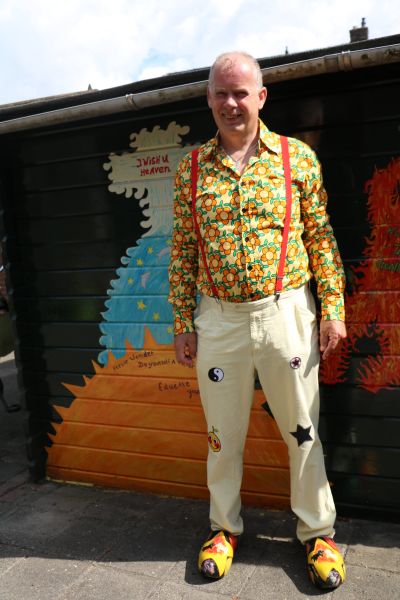 Ik moet meteen aan de fameuze naïeve schilder Ruurd Wiersma ( 1904 – 1980) uit Burdaard denken, als ik mijn voet over de drempel van Ronny Leistra zijn huis zet. Wiersm die van zijn woonkamer een groot geschilderd kleurig panorama maakte. Wanden, plafond, meubilair niets in het huis van de voormalige melkvaarder ontsnapte aan het penseel van Wiersma, een eerste klas zondagsschilder. Zo panoramisch is het bij Ronny Leistra nog niet, maar de schutting, het fietsenhok, de klompen, het plafond heeft inmiddels een kleurrijke metamorfose ondergaan door toedoen van de Sneker kunstschilder. Ronny Leistra is geen naïeve schilder, en als we dan toch een etiketje moeten plakken dan hoort Ronny meer thuis bij de Outsider Art groep. Het zijn kunstenaars die vaak een beetje ‘anders’ zijn, bij deze kunstenaars komt kunst rechtstreeks naar boven borrelen. Het werk van Ronny Leistra is uitermate boeiend, veelzijdig en vooral puur! Op kattebelletjes maakt hij aantekeningen en krabbels die hij later uitwerkt.