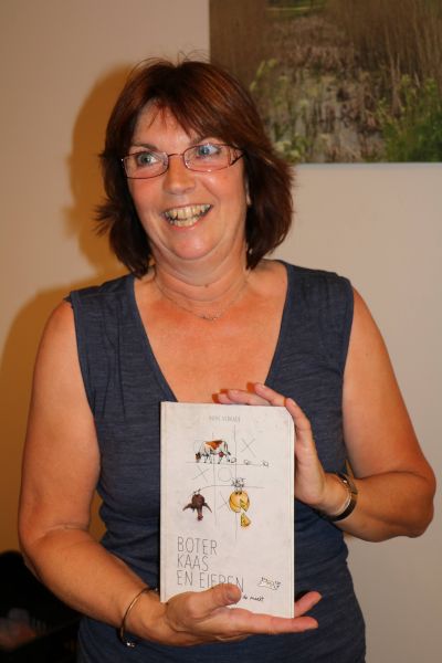 Zij heeft een boekje geschreven met de alles zeggende titel ‘Boter, Kaas en Eieren- een dag op de markt’. Ik heb het boekje als tussendoortje met smaak gelezen. Prachtig het verhaal van zo’n muts die voor de marktkraam staat alle ‘jammetjes en cutneys’bekijkt, ze keer op keer in de hand neemt. De appelstroop, de pruimenjam, de uienchutney, de honing, de perensap, de appelsap en de dubbelsap en alle combinatiejams die zij beleg noemden, zoals de aardbeienrabarberbeleg, het appel-kersenbeleg, het…kortom alles, alles had zij al vast gehad.