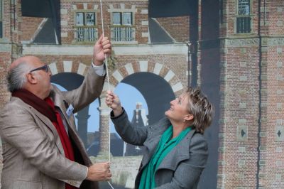 Vanmiddag opende SWF-wethouder van cultuur, Mirjam Bakker, het infocentrum voor het pretentieuze muziekfestival. Dat deed Bakker samen met Ben van der Knaap, artistiek leider van At the Watergate, door een reusachtig Waterpoortzeil omhoog te hijsen en daarna de bezoekers, voornamelijk de ‘incrowd’ uit het Sneker en Friese cultuurwereldje, uit te nodigen voor bubbels zonder alcohol.