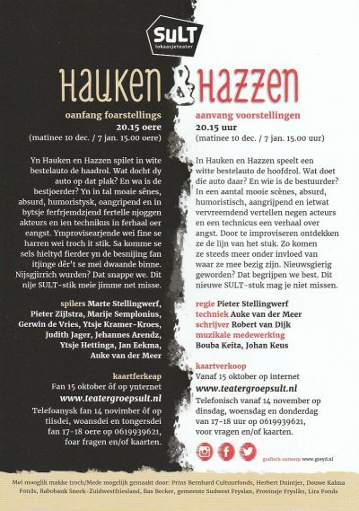 Gisteravend in Café De Bûnte Bok in Lioessens weest bij kroechteaterfoarstelling Kredyt. Ut stuk is de opfòlger fan de súksesfolle teaterstukken Kataris, Kredo en Krimp. Om futdaleks mar met de spreekwoardeleke deur in hús te fallen: prachtavend had en genoaten fan fòrmidabele akteurs Anke Bijlsma & Gerrit Haaksma. Wat un rykdomdom dat je in su’n ouwe autentike dòrpskroech tegare met nòch su’n 50 minsen un teateproduksy fan hooch nivo metmake magge.