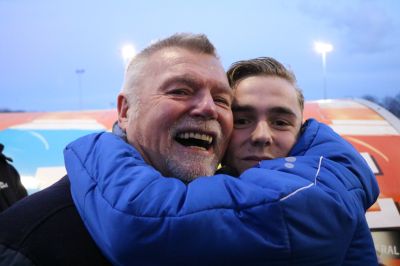 Op de eerste foto knuffelen opa Jan en kleinzoon Jantje Dommerholt elkaar na afloop van de eclatante overwinning.
