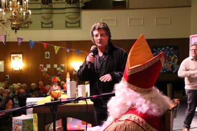 Burgemeester Hayo Apotheker, druk bezig met zijn afscheidstournee, had de moeite genomen om het feest bij te wonen. Hij bedankte niet alleen de 70-plussers die aanwezig waren voor de geweldige tijd die hij in Sneek had gehad als burgervader, maar hij zong samen met een van de Pieten ook nog eens uit volle borst ‘Ut Woanskip’ voor de enthousiaste zaal.