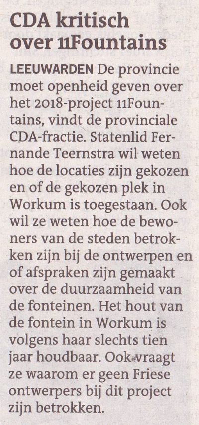 En nou komt de provinsjale CDA-kollega met ‘kritise fragen’! Frou Teernstra het blykber sitten te slapen toen artistyk projektleider Anna Tilroe fan de 11 Fountains útlei in un froech stadium (seker twee jaar leden) wêrom’t der gyn Friese kunstenaars an ut hele projekt metdoën: