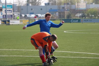 Op de foto is te zien hoe Fabian Stevens in glijvlucht naar de 1-1 gaat!
